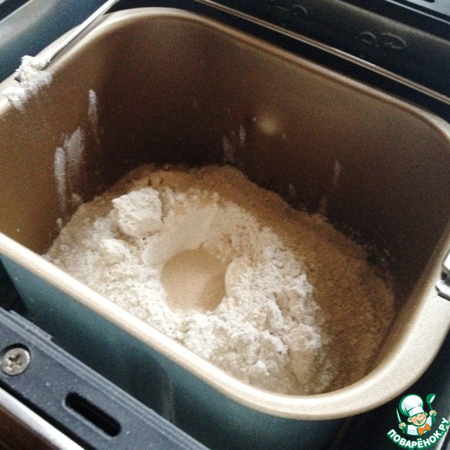 Ведёрко хлебопечки смазать маслом. Поместить в него ингредиенты в следующей последовательности: