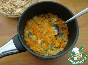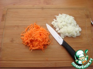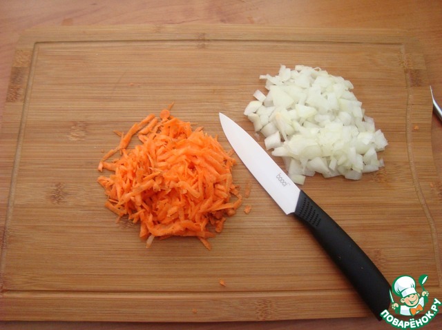• Морковь натираем на тёрке, лук мелко режем.