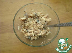 • Открываем банку и сливаем жидкость. Рыбу выкладываем в посуду и вилкой разминаем.