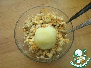 • Картофель чистим и разминаем вилкой. Всё хорошо соединяем. Если вам мало соли, то досолите, можете поперчить и добавить яйцо. Я этого не делала. Мне соли хватило, и мне сегодня захотелось сделать без яйца.