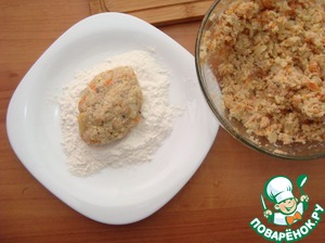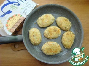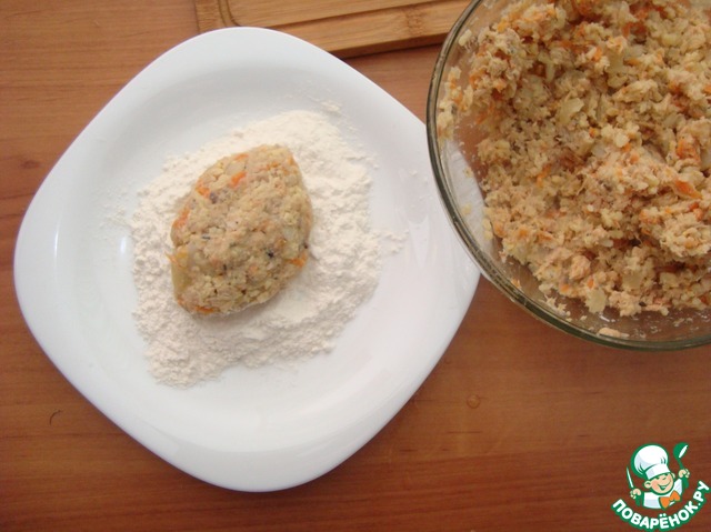 • Формируем котлеты и обваливаем их в муке. Выкладываем на разогретую сковороду в растопленное масло, сливочное или в какое вы захотите.