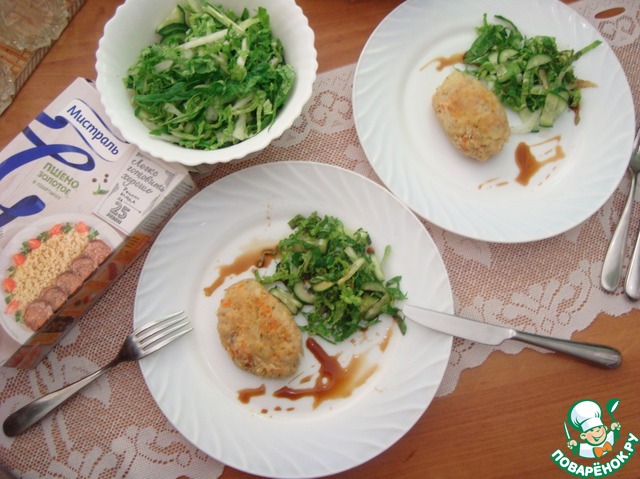 • Получилось 6 котлет. Котлеты жарим быстро, так как продукты у нас все готовые, до красивой корочки с обеих сторон.