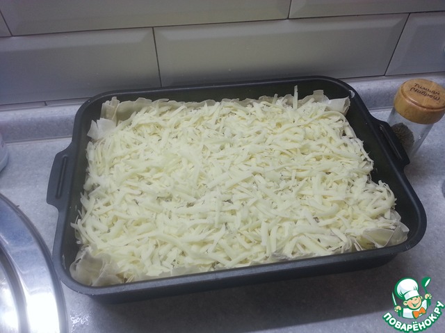 В форму выкладываем тесто, грибную начинку, так чтобы у теста остался бортик 3 см. и тертый сыр. -