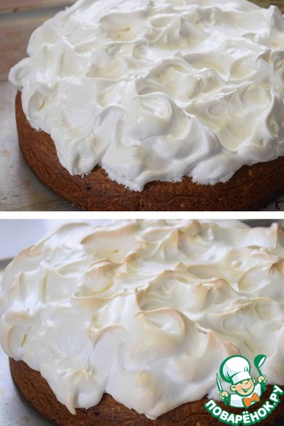 Ложкой выкладываем взбитые белки и отправляем на 10 мин в разогретую до 180°С духовку. Затем охлаждаем пирог и выкладываем на блюдо.