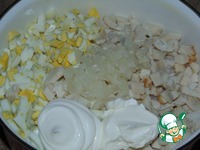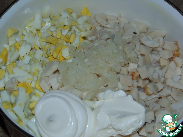 Маринованный лук добавить в салат, посолить. Заправить сметаной и майонезом, перемешать. Мягкий и чуть-чуть сливочный привкус риса Кубань, даёт ощущение, что в салате присутствует сыр. |