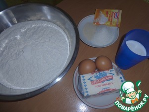 • Молоко соединить с яйцами, сахаром и ванильным сахаром. Добавить дрожжи и просеянную муку. Муку добавляйте частями пока не получится мягкое и эластичное тесто. Затем вымешивать тесто, частями подливая растопленное масло (или маргарин).
