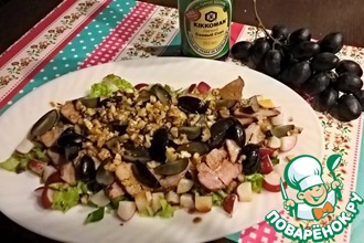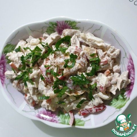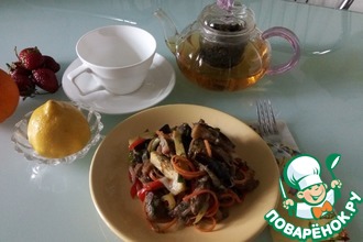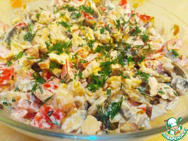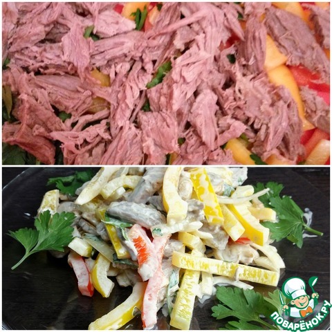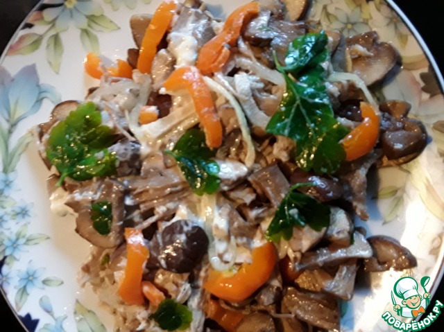 Решила поделиться с Вами вкусным и сочным салатиком с не избитым вкусом. Болгарский перец освежает, жареные грибочки придают ему особенный аромат. В то же время немного мяса делает салатик сытным. Угощайтесь!