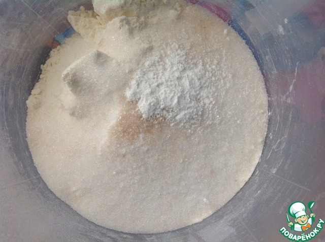 Смешать сначала сухие ингредиенты:муку, сахар, соду, соль