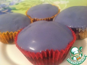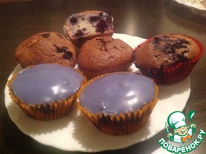 Разложить по бумажным формочкам и выпекать в разогретый до 200 градусов духовке 20 минут. Готовые маффины покрыть глазурью. Для её приготовления сахарную пудру смешать с лимонным и черничным соками.