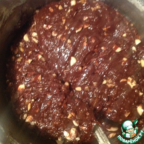 Орехи порубить (для усиления вкуса я их предварительно обжариваю на сухой сковороде), смешать с мукой и постепенно, небольшими порциями вмешать в шоколадную массу.