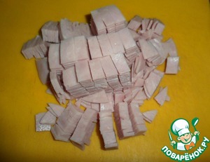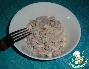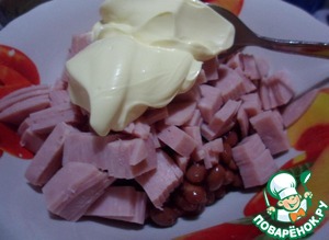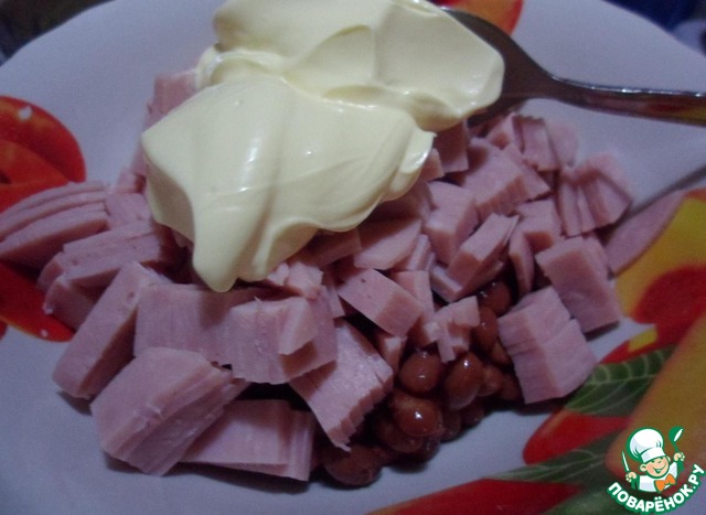 Добавить ветчину к фасоли, туда же добавить майонез, лучше брать вкусный (у меня оливковый), перемешать. Соли не надо.