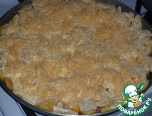 Отправляем в разогретую духовку примерно на час пятнадцать (все зависит от духовки) до золотистой корочки сверху. Не забываем менять местоположение сковороды с нижней полки на верхнюю, чтобы и низ и верх пропеклись равномерно