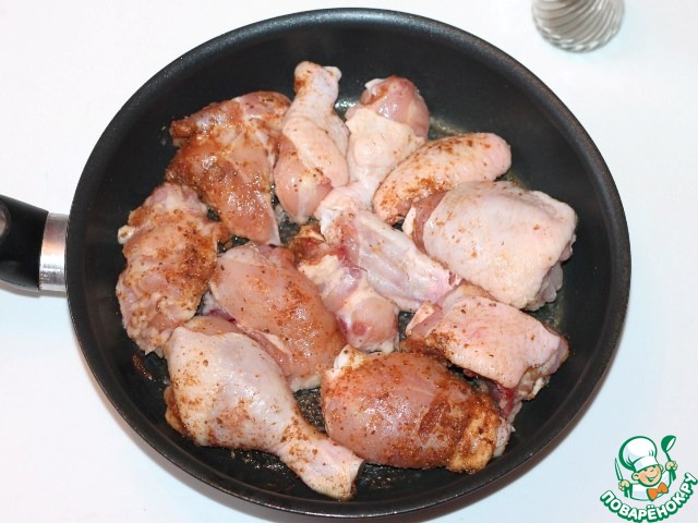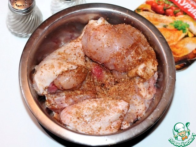 1. Промываем под проточной водой курицу, сушим бумажным полотенцем и режем на порционные части. Смазываем кусочки курочки соусом-маринадом (1-2 ст. л.)...