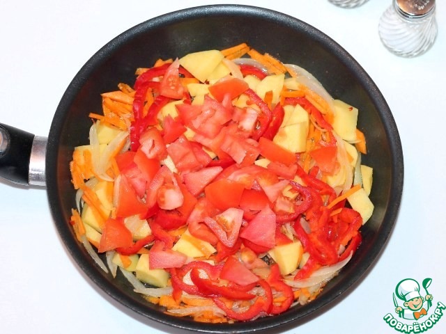 8... и перец (без семян). Добавляем порезанные дольками картофель..