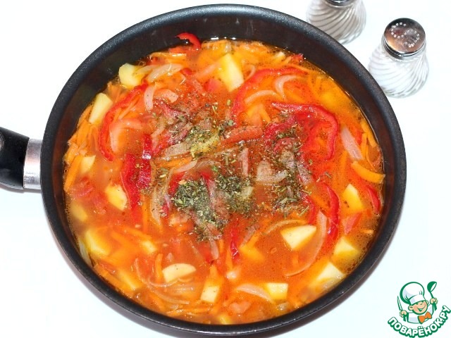 10. Кладем томатную пасту, приправу для овощей, солим, перчим, добавляем стакан горячей воды и тушим до готовности картофеля. Можно немного добавить щепотку сахара.