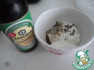 Для маринада смешиваем сметану, соевый соус, соль, хмели-сунели, мускатный орех, базилик.