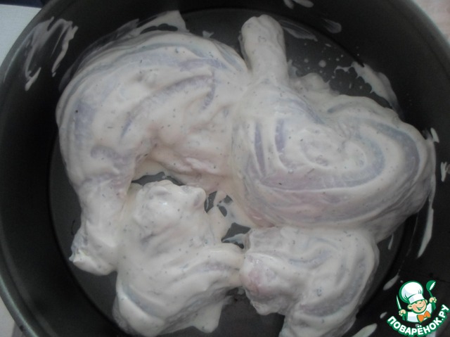 Я брала 2 окорочка и 2 крылышка. Обмазываем все это дело маринадом. Укладываем в форму, убираем на пару часов (в идеале на сутки) в холодильник.