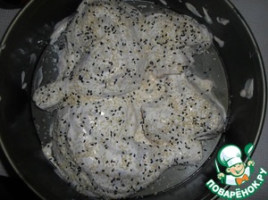 Обильно обсыпаем кунжутом. Запекаем в предварительно разогретой до 200-220 градусов духовке до готовности.