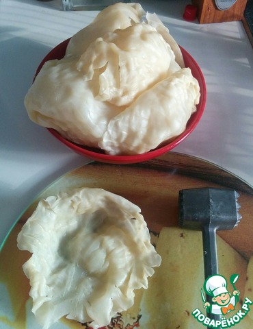 Капусту разобрать на листья, отварить, пока не станут мягкими. Срезать ножом утолщения, а если капуста старая, как у меня, то немного отбить молоточком для того, чтобы лист стал более послушным.