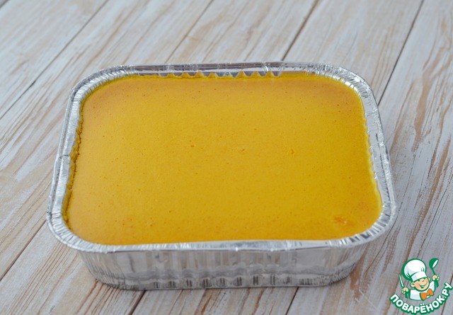 Достать тесто из холодильника и распределить его по дну формы. Выпекать в разогретой до 180 градусов духовке минут 5-7. Я делала чизкейк в форме из алюминиевой фольги размером 17/17 см. Можно печь в силиконовой форме, будет удобнее достать из такой формы.