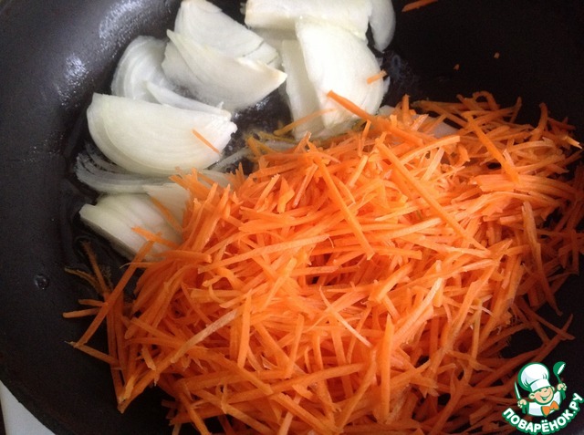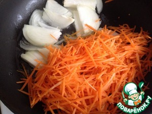 Морковь натереть на терке для корейской моркови. Лук нарезать полукольцами. Обжарить овощи в небольшом количестве растительного масла до готовности.