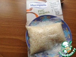 Пакетик риса отварить в подсоленной воде согласно инструкции на упаковке. Готовый рис прямо в пакете промыть под холодной водой. Дать стечь лишней жидкости.