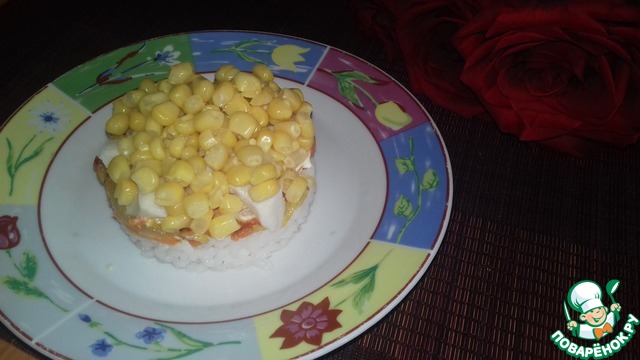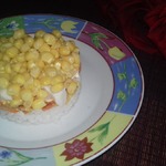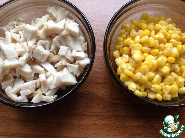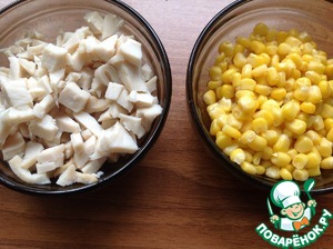 С кукурузы слить жидкость, кальмары нарезать небольшими кубиками.