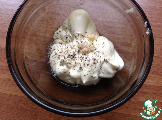 К майонезу добавить чеснок, пропущенный через пресс, и смесь перцев. Перемешать.