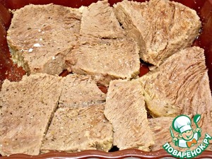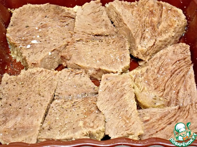 Отварную говядину нарезать на кусочки. Форму смазать маслом, налить 3 ст. л. воды и разложить говядину.