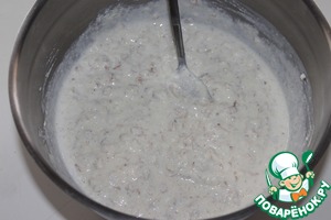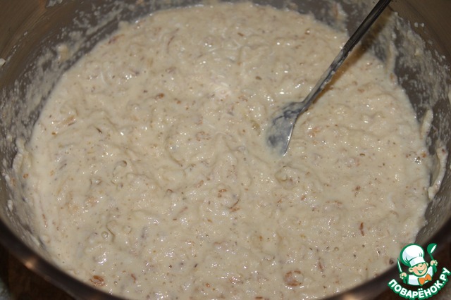Когда смесь набухнет, перемешаем ее. Добавляем соду, погашенную лимонным соком, соль, сахар и яйца. Добавляем 3 ст. ложки растительного масла и хорошо перемешиваем. Трем яблоко на мелкой терке и добавляем к смеси. Перемешиваем.