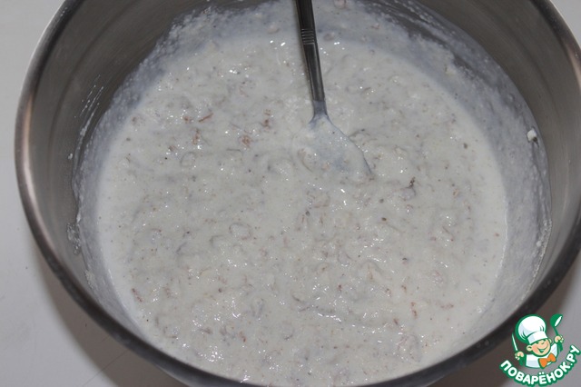 Хлопья и манную крупу смешиваем и заливаем кефиром, хорошо мешаем и оставляем на 1-2 часа.