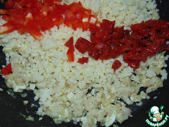 В мясу добавила отварное пшено, болгарский перец и вяленые томаты.