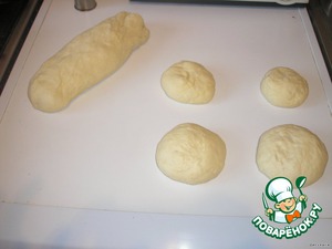 Из теста накрутить шариков. У меня получилось 8 шт. Но лучше делать побольше шариков, но меньшего размера. А то булки получаются как в магазине - булка большая, начинки мало :)