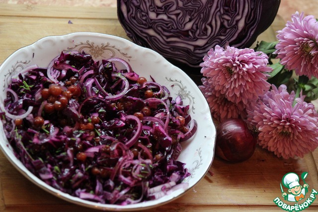 Лук нарезать полукольцами, смешать с капустой и брусникой. Лучше всего здесь уместна брусника моченая или замороженная, т. к. свежая брусника обладает горечью. Перемешать. Салат заправить уксусом, затем подсолнечным маслом.