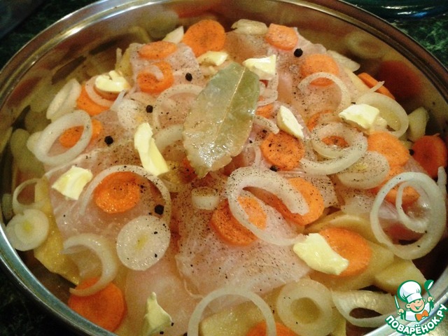 Уложить на дно глубокой сковороды или сотейника картофель, сверху разложить куски рыбного филе.