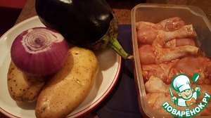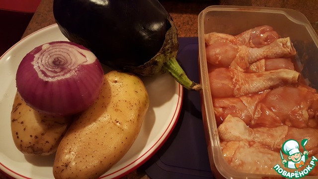 Выложить на дно баклажаны и лук, сверху выложить картофель, смазанный оставшимся маслом.