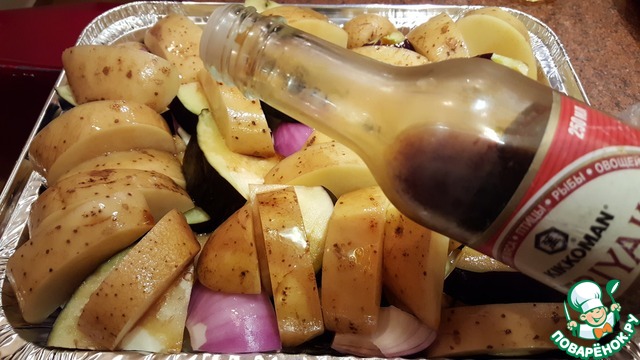 Картофель, баклажаны и лук в Египте самые потребляемые в пищу овощи и присутствуют на столах, в кафешках, отелях и магазинах Египта круглый год. Такой гарнир мы кушали с мужем, отдыхая в отеле, обычно на ужин. Конечно, мой любимый соевый соус Терияки ТМ Киккоман моя личная добавка в это блюдо, придавшая гарниру пикантности. Угощайтесь!