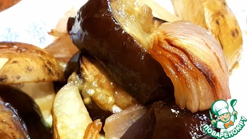 Лук остается плотным и немного хрустящим, картофель получается с вкусной корочкой и мягкий внутри, а баклажаны мягкие, тающие во рту.