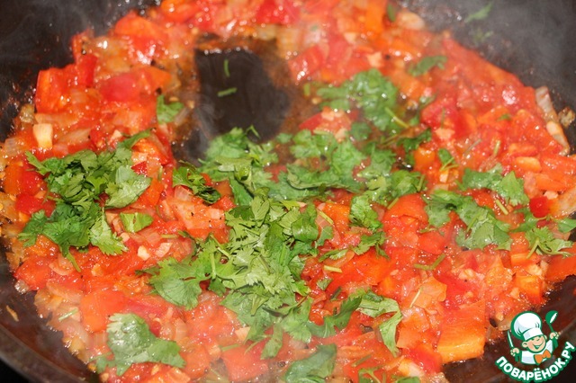 Огонь увеличить до максимального, чтобы лишняя жидкость испарилась, добавить рубленую зелень кинзы, перемешать, огонь выключить.