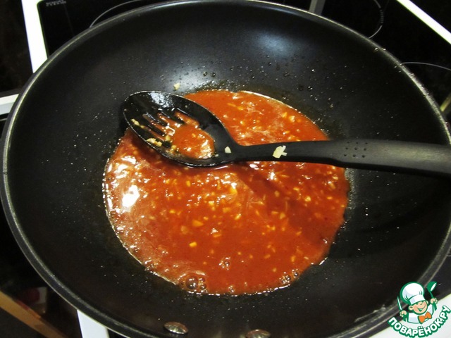 К слитому соусу добавить крахмал и красный перец, тщательно перемешать и отправить на сковороду к чесноку.