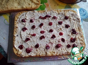 Прямоугольный торт весом около 6 кг с абрикосовой пропиткой, двумя видами крема (сливочно-йогуртовый с мягким творогом ricottine с вишнями и воздушно-творожный с арахисом (перемолотым или мелко порезанным))
