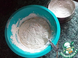 Достаем и понемногу вводим сахарную пудру и крахмал. И хорошенько вымешиваем -