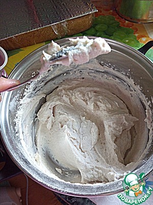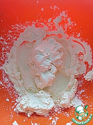 Теперь небольшими порциями добавляем творог, не переставая взбивать
