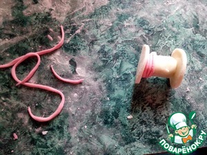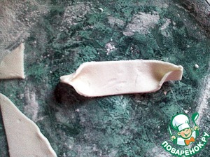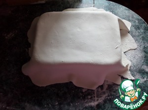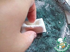 Отрезаю полоску из мастики. Смазываю углы водой и соединяю между собой (левый угол с левым, правый с правым)