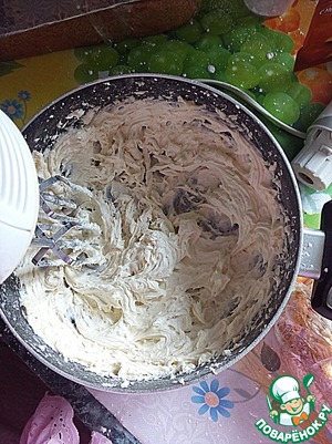 Затем туда же выкладываем мягкий сыр ricottine (200 гр) и 1-1,5 ст. л. сахарной пудры (через сито) и снова взбиваем до однородной смеси.