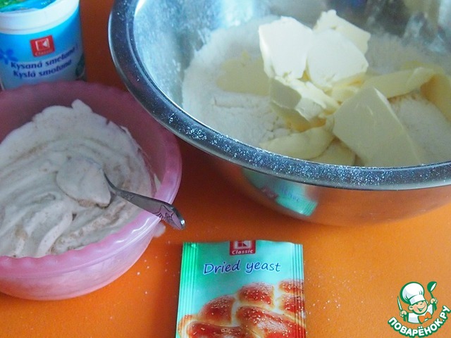 Дрожжи и щепотку соли высыпать в сметану, перемешать.