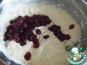 Творог смешать с яйцами, добавить половину пачки ванильного пудинга, сахар по вкусу, бруснику и цедру, все перемешать.