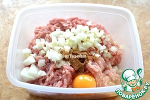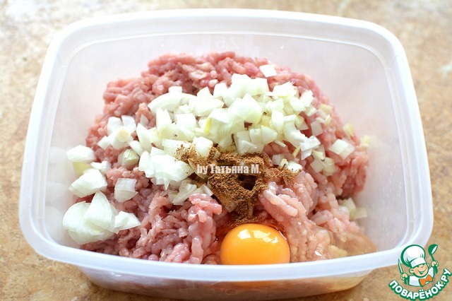 К фаршу добавить яйцо, мускат, лук, размешать;