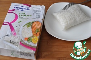 Берём рис и готовим его согласно инструкции на упаковке. Я выбрала рис басмати в пакетиках от "Мистраль". Заливаем пакетик с рисом водой, доводим до кипения и варим 12 минут до готовности на медленном огне.