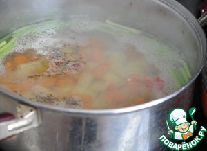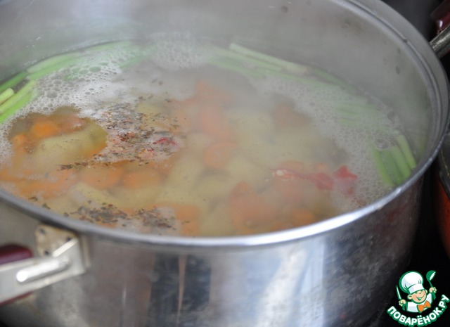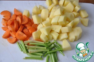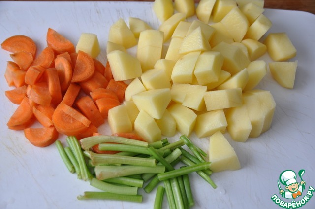 Овощи моем, чистим. Режем кубиками картофель и морковь, сельдерей соломкой.